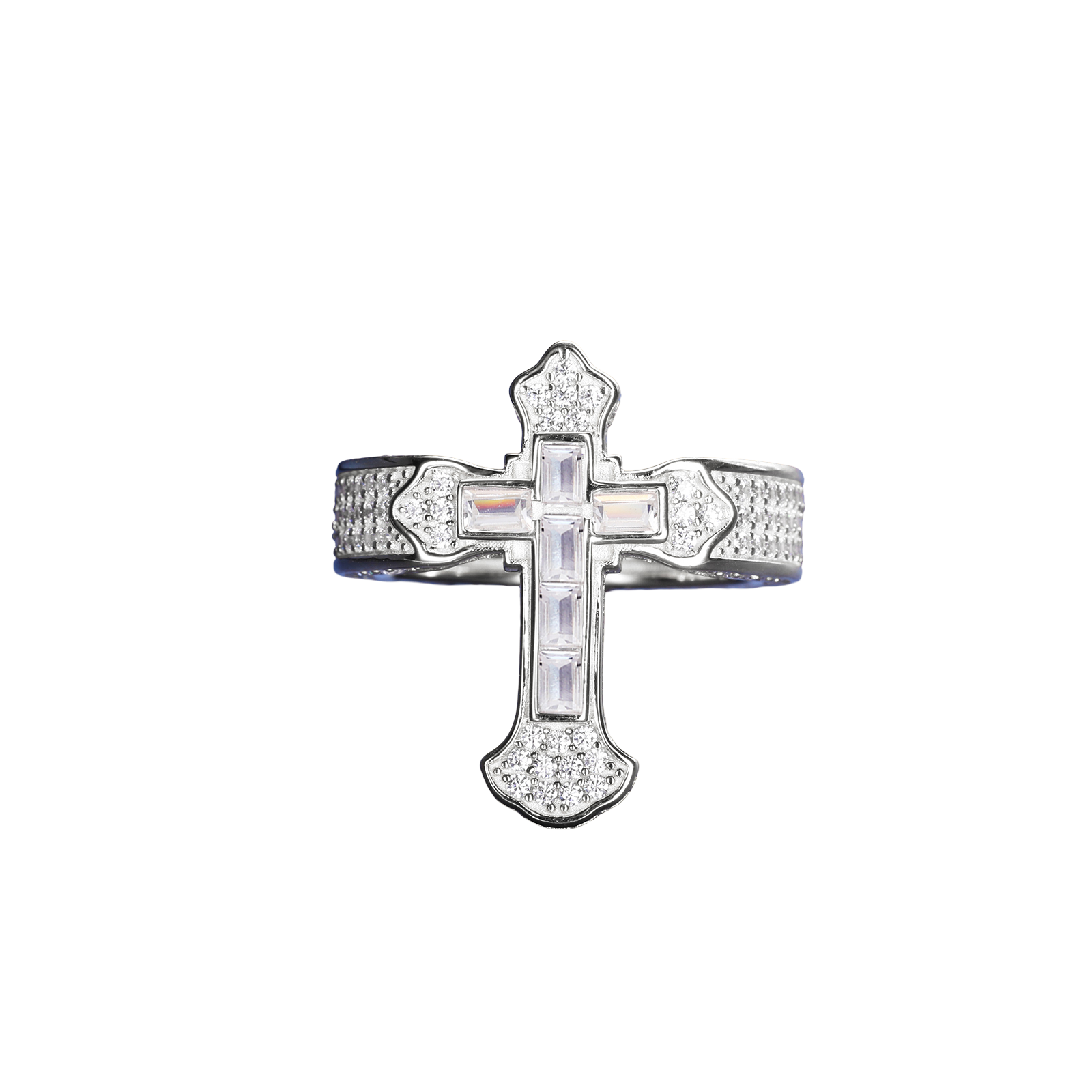 Faith, redefined in brilliance. The Baguette Cross Ring features a bold cross centerpiece set with flawless baguette-cut VVS moissanite stones, surrounded by pavé-set accents that shine from every angle. Crafted from 925 sterling silver and plated five times in rhodium, this ring blends spiritual symbolism with luxury design. A powerful statement piece with eternal meaning and unmatched shine.