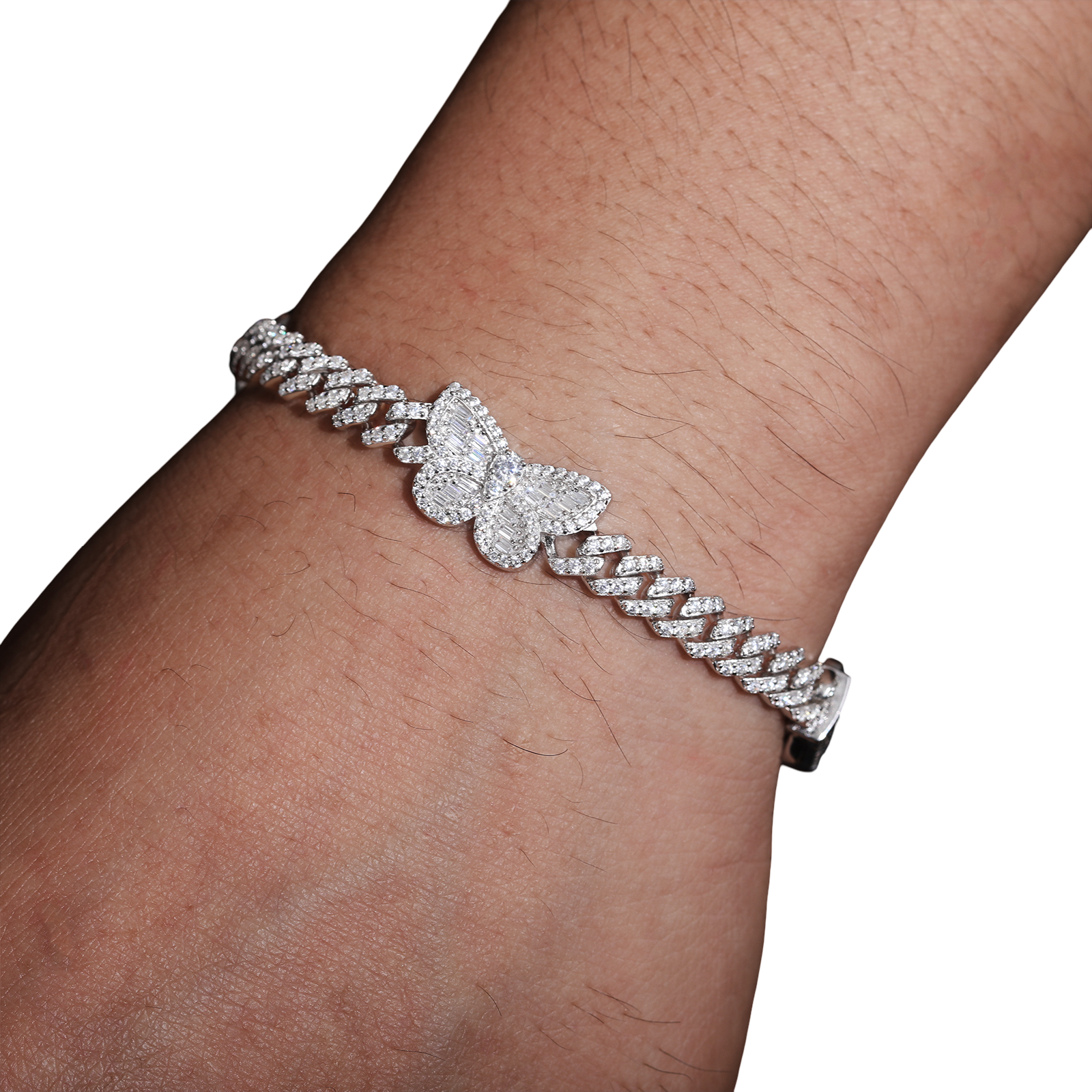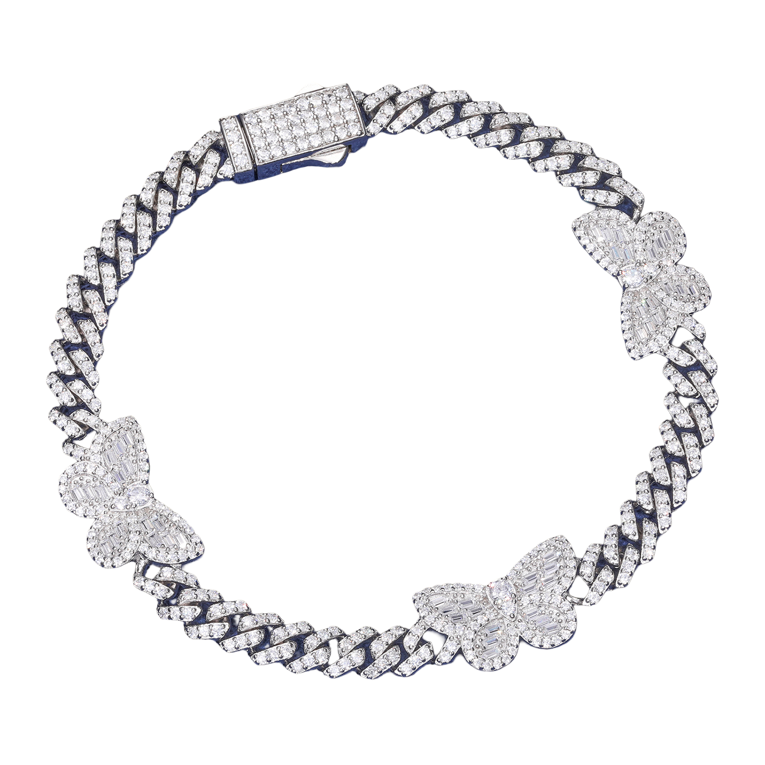 Where bold meets beauty. The Butterfly Cuban Link Bracelet fuses the classic strength of Cuban links with the elegance of iced-out butterfly accents. Each butterfly is set with VVS flawless moissanite stones that pass all diamond testers, while the base is crafted in 925 sterling silver and finished with five layers of rhodium plating. A perfect mix of power and grace, designed to shine.