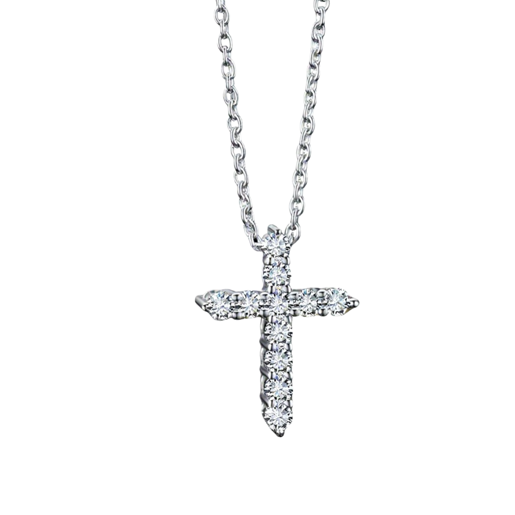 Timeless faith, elevated in brilliance. The Cross Necklace features a sleek pendant set with round-cut VVS flawless moissanite stones that pass all diamond testers, offering unmatched sparkle and clarity. Crafted from 925 sterling silver and plated five times in rhodium, it’s both elegant and durable. A minimalist yet powerful piece, perfect for daily wear or layering.