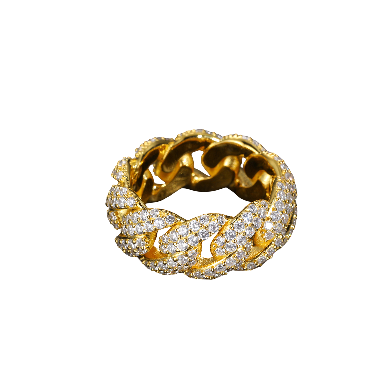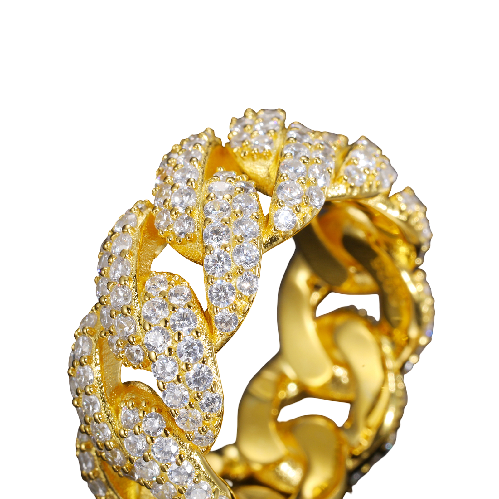 An iconic design, elevated in luxury. The Round Cuban Link Ring features the classic Cuban link pattern, fully iced with VVS flawless moissanite stones that pass all diamond testers. Crafted from 925 sterling silver and plated five times in rich yellow gold, this bold band combines timeless streetwear influence with high-end brilliance. A standout piece for everyday shine.