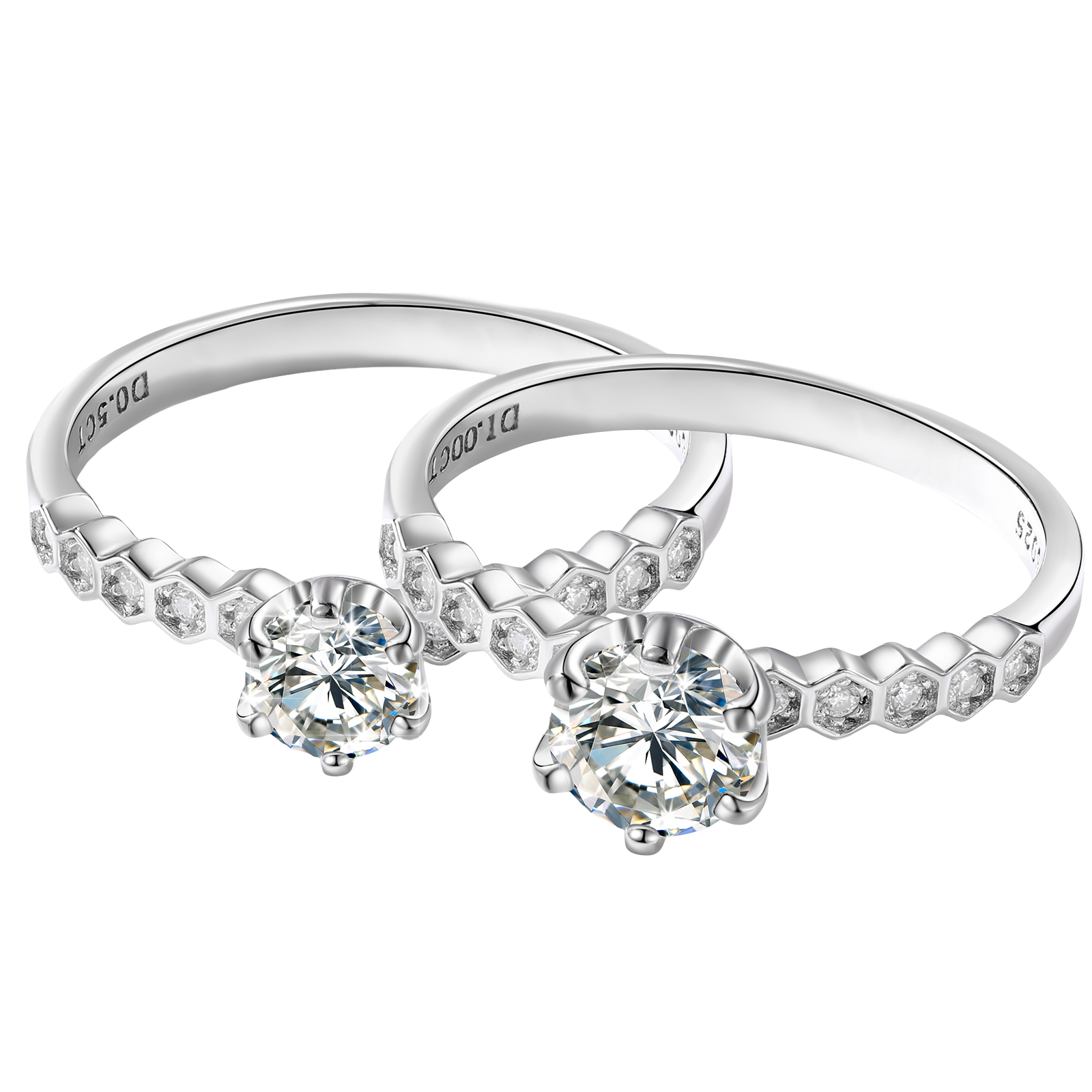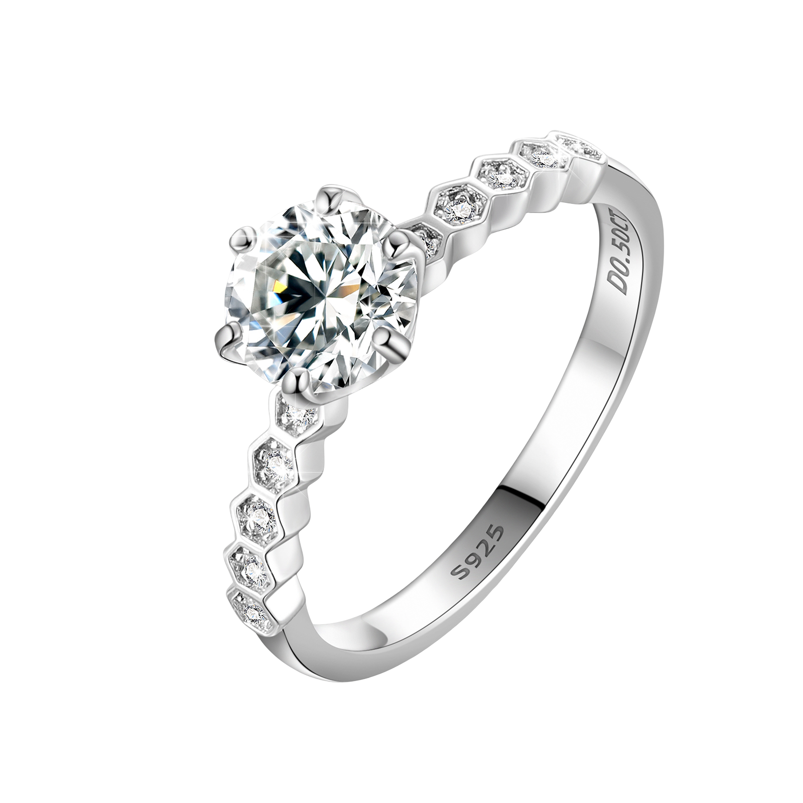 A modern twist on timeless love. This Engagement Ring features a brilliant round-cut VVS flawless moissanite center stone, held securely by six prongs and framed by a unique hexagon-accented band, each set with additional sparkling moissanite stones that pass all diamond testers. Crafted from 925 sterling silver and plated five times in rhodium, it’s a stunning symbol of forever.
