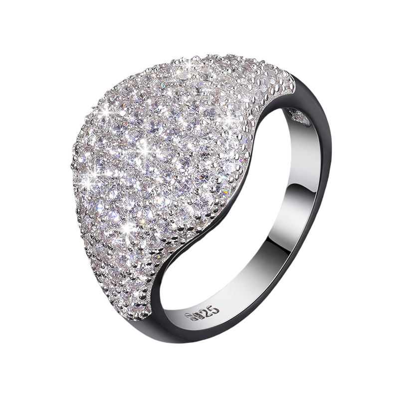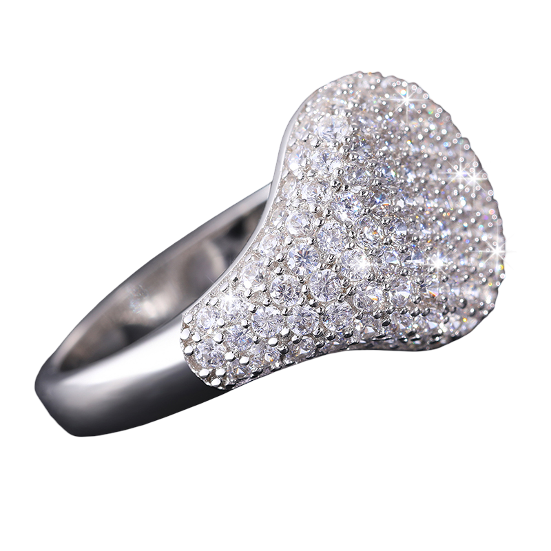A wave of brilliance. The Full Pavé Ring features a sleek, curved silhouette fully encrusted with VVS flawless moissanite stones that pass all diamond testers. Crafted from 925 sterling silver and finished with five layers of rhodium plating, it delivers intense sparkle with a smooth, modern edge. Sophisticated, radiant, and built to stand out.