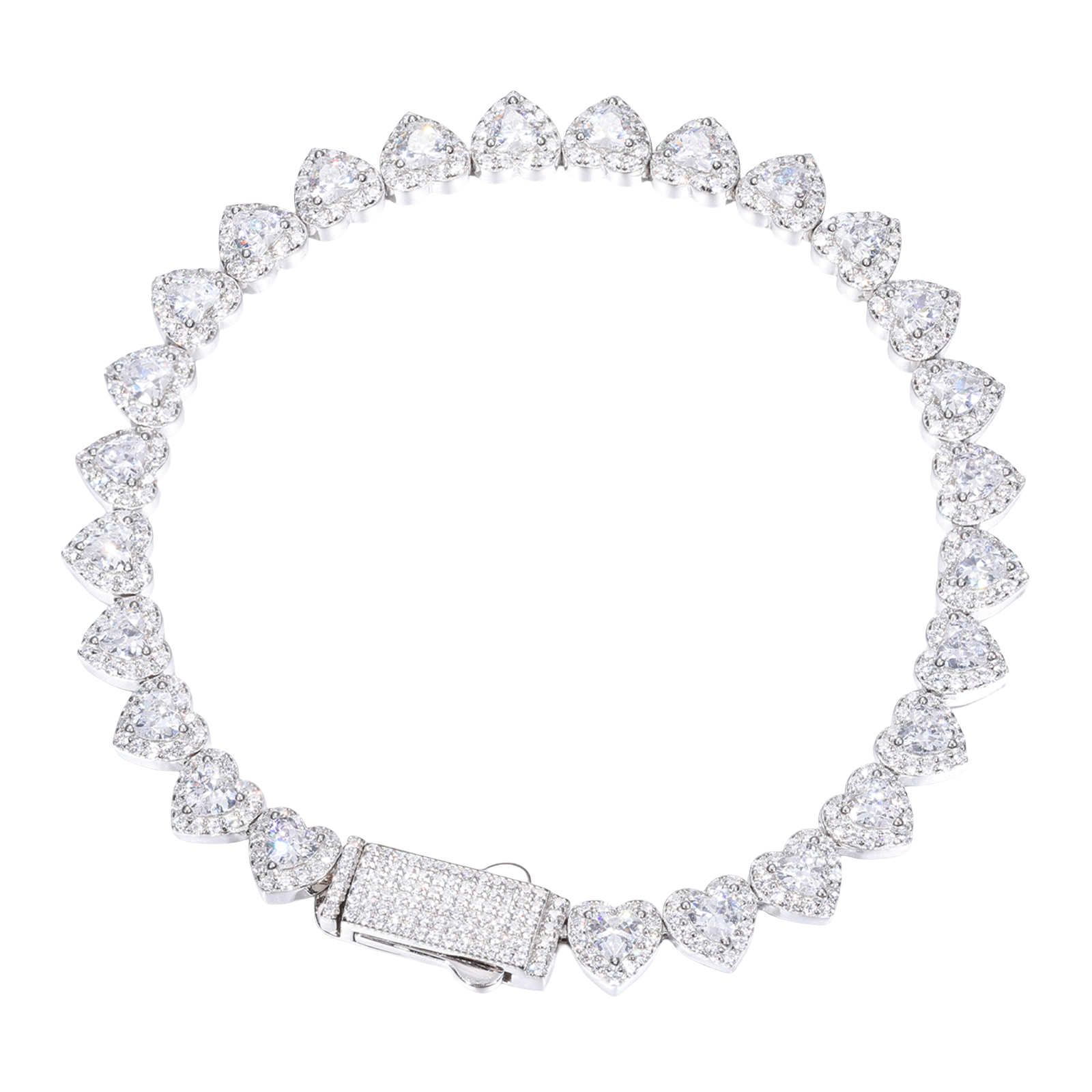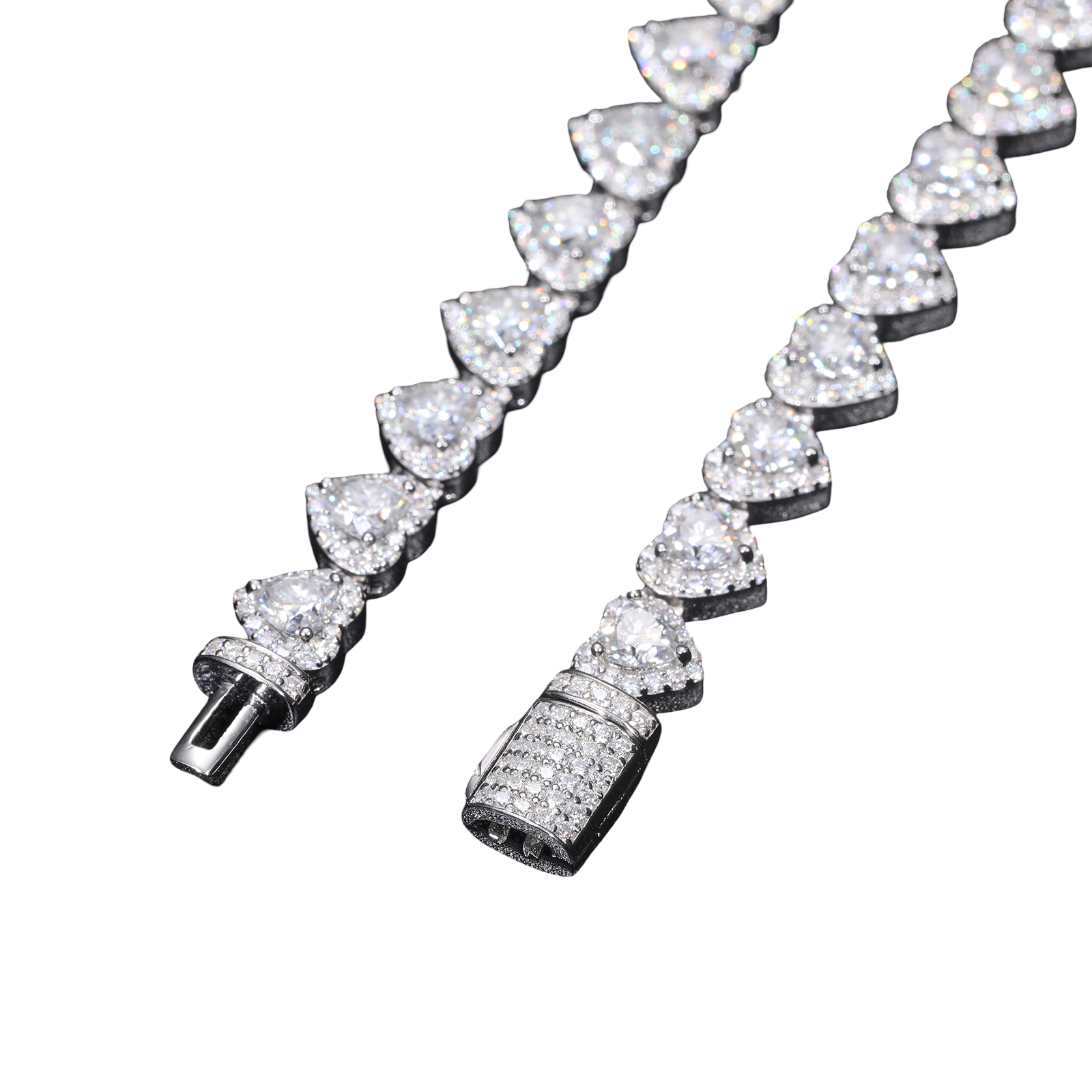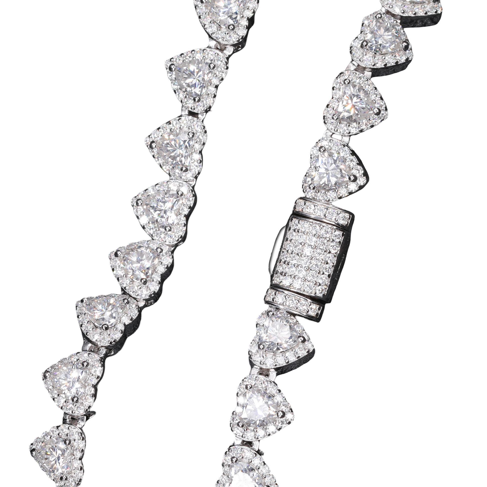 Romantic elegance meets high-end luxury. This Hearts Tennis Bracelet features a row of heart-shaped VVS flawless moissanite stones, each one meticulously set in 925 sterling silver and plated five times in rhodium for a lasting, radiant finish. Every stone passes diamond testers, ensuring brilliance that rivals natural diamonds. A perfect piece for adding love and light to any look.