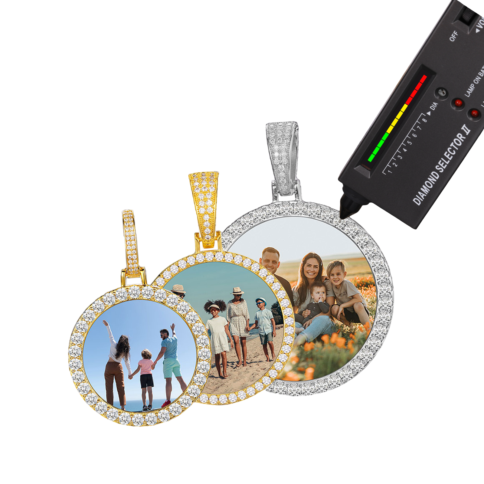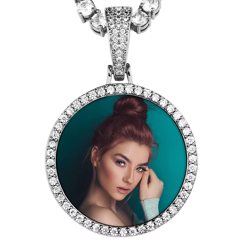 Crafted in premium 925 sterling silver and plated five times in rhodium for maximum brilliance and durability, this water-resistant pendant features flawless VVS moissanite stones that pass all diamond testers. Available in 25mm, 35mm, and 45mm sizes, the Icedout Photo Round Pendant offers a bold, personalized statement piece with unmatched shine and luxury.