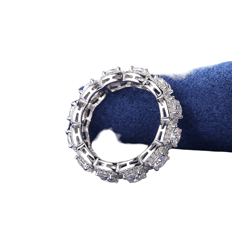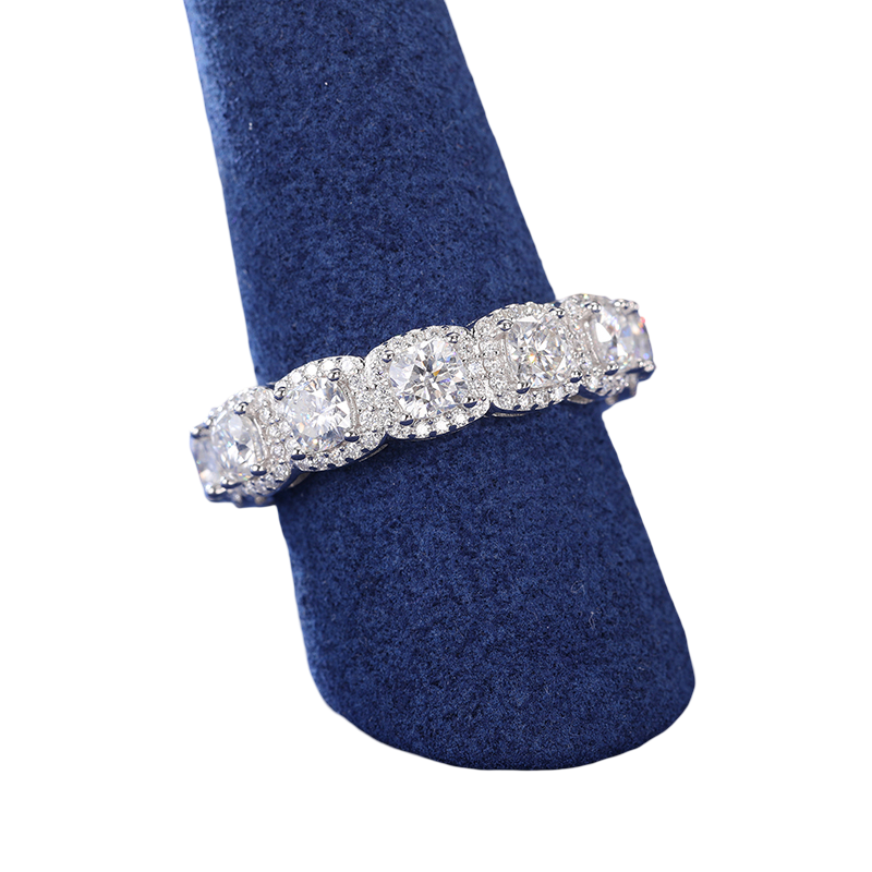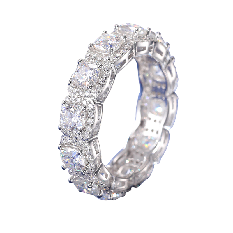 Classic brilliance with a custom edge. The Custom Tennis Ring features a full eternity band set with large cushion-cut VVS flawless moissanite stones, each surrounded by a halo of micro-pavé stones, delivering maximum fire and clarity that passes all diamond testers. Crafted from 925 sterling silver and plated five times in rhodium, this ring is designed to shine from every angle. A timeless piece, elevated.