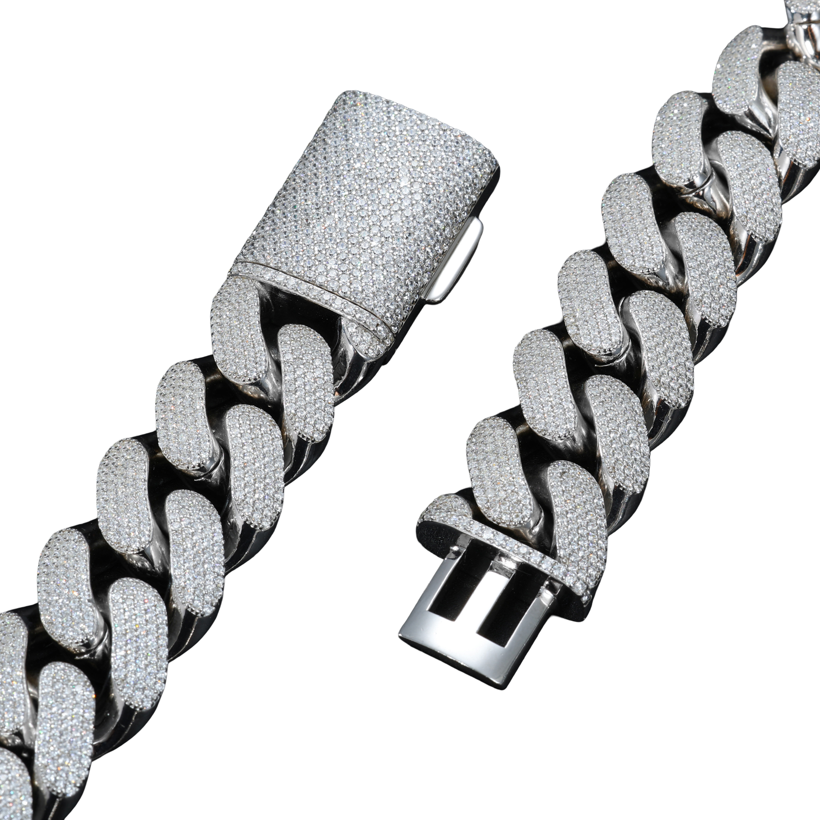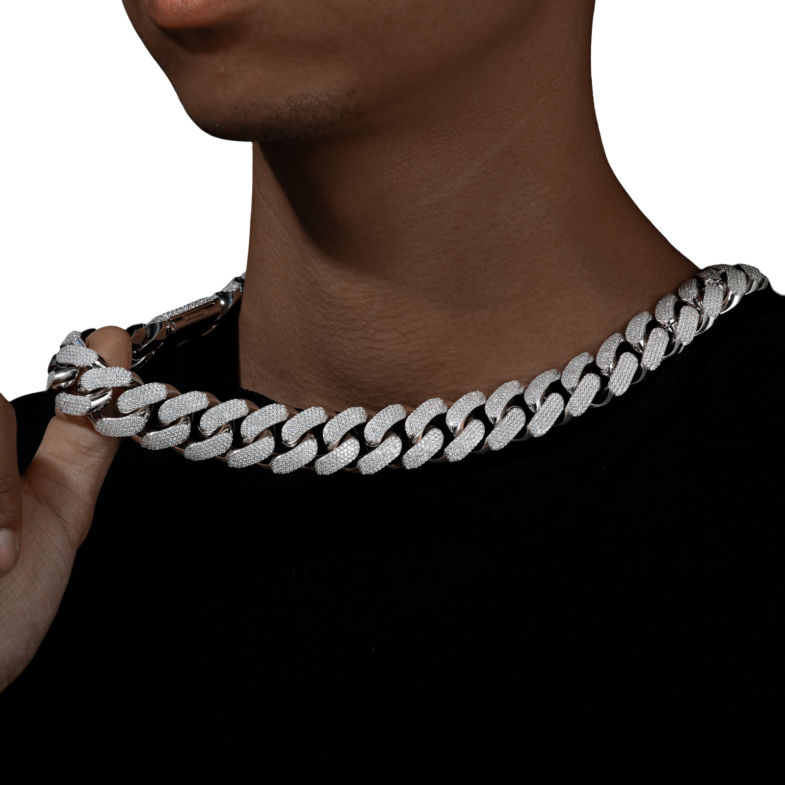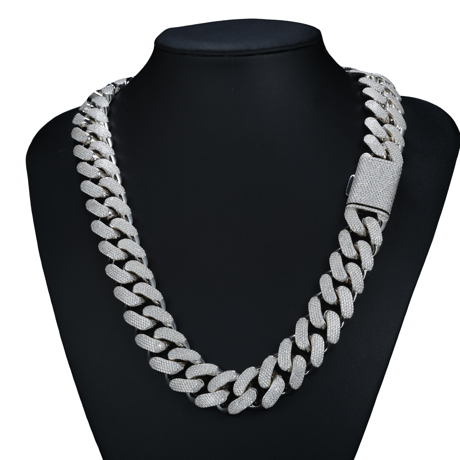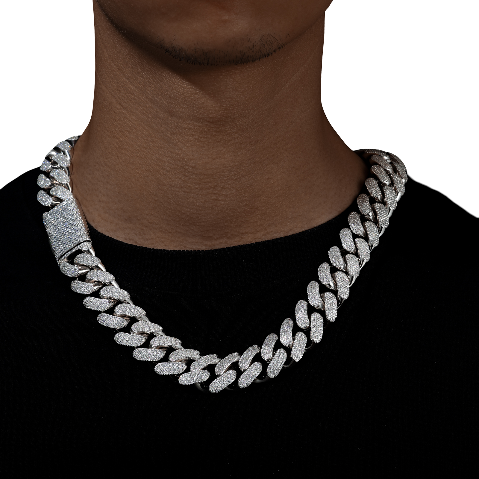 Heavyweight luxury at its finest. The Top Iced Cuban Chain, height of 20mm, fully flooded with VVS flawless moissanite stones that pass all diamond testers. Crafted from solid 925 sterling silver and coated in five layers of rhodium plating, this chain delivers unmatched shine, durability, and presence. Designed for those who move different.